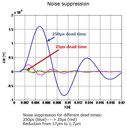 As shown above there is a reduction of the noise by factor 10 and also the damping is much better: The deviation is less than 1µm after 2ms counting from the starting point of the disturbance (red curve) compared to roughly 20ms (blue curve).