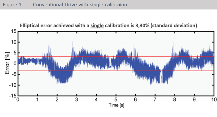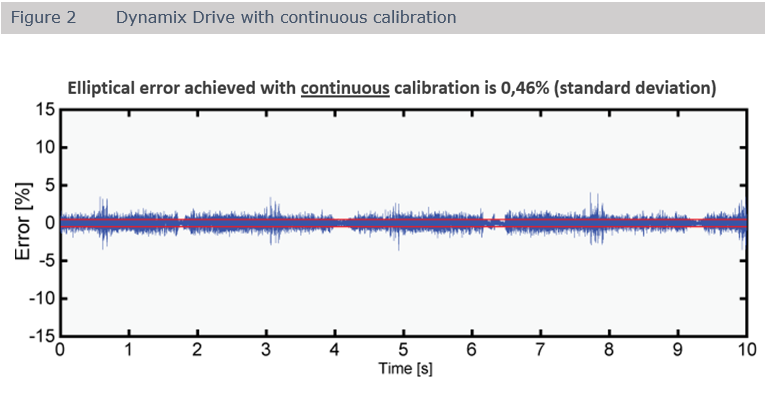 Our Dynamix Servo drives continuously recalibrate all five parameters (offsets, amplitudes and phase) with a frequency of 100kHz in the background during the drive is performing motion to minimize the first order elliptical errors. A comparison between figure 1 and 2 shows a drastic reduction of the elliptical errors by a factor > 8.