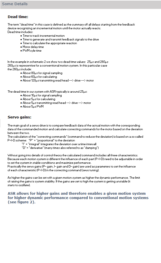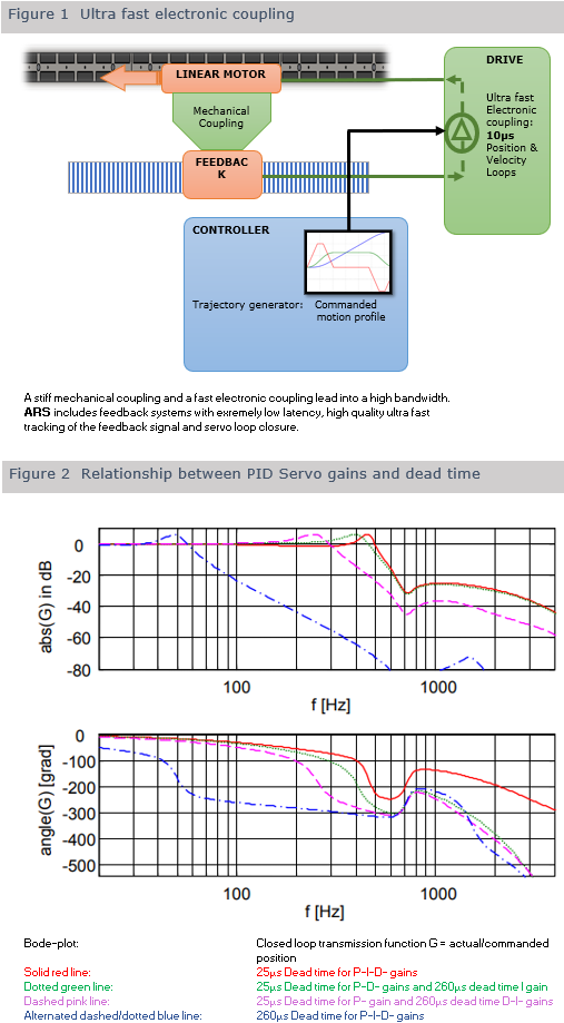 ARS technology is essentially based on consequently minimizing the signal deadtime between motor on the one hand and feedback on the other hand. Motor and feedback system are coupled mechanically and electronically (figure 1). Assuming the mechanical coupling is very stiff ARS actively damps resonances simply because the drive is able to react fast enough. Compared to conventional drives our drives include a faster and better feedback signal tracking and is capable of reacting up to 10 times faster (100kHz).