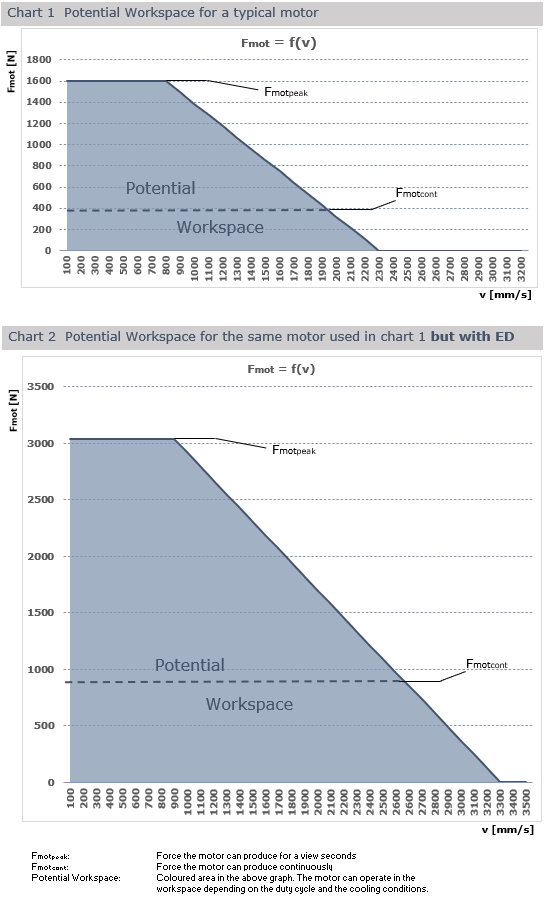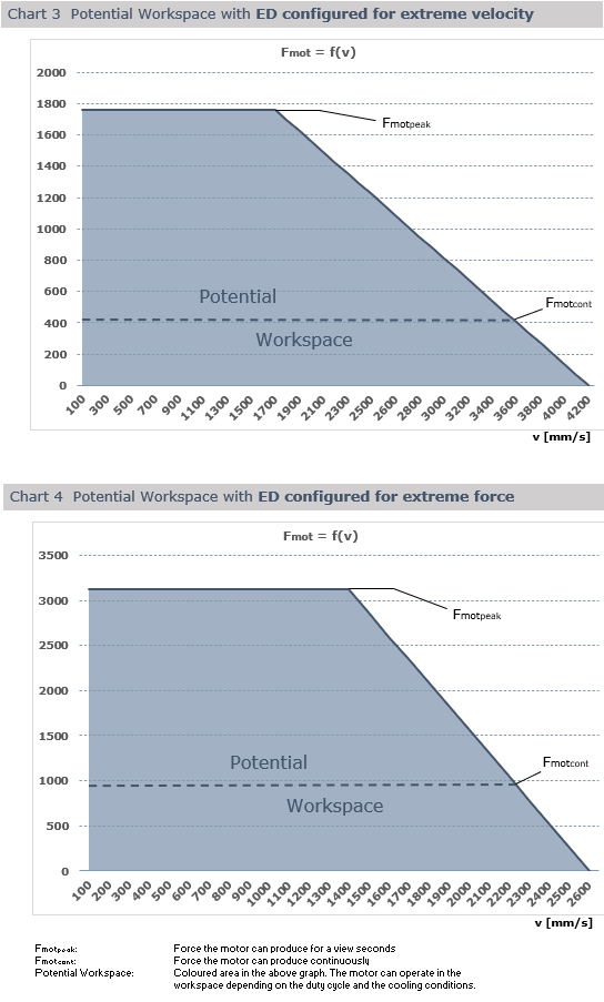 The Extended Dynamics [ED] option expands the workspace (area under the graph) horizontally (max. velocity) by approximately 45% and vertically (Fm) by round about 90% as shown in chart 2. Depending on the application ED can also be configured for extreme velocity expansion (vmax increases by more than 80% and Fm increases by 10% as shown in chart 3) or for extreme force expansion (Fm increases by 95% and vmax by approximately 10% as shown in chart 4).