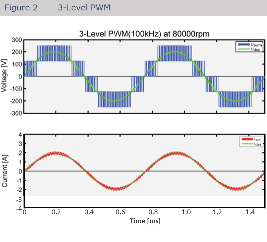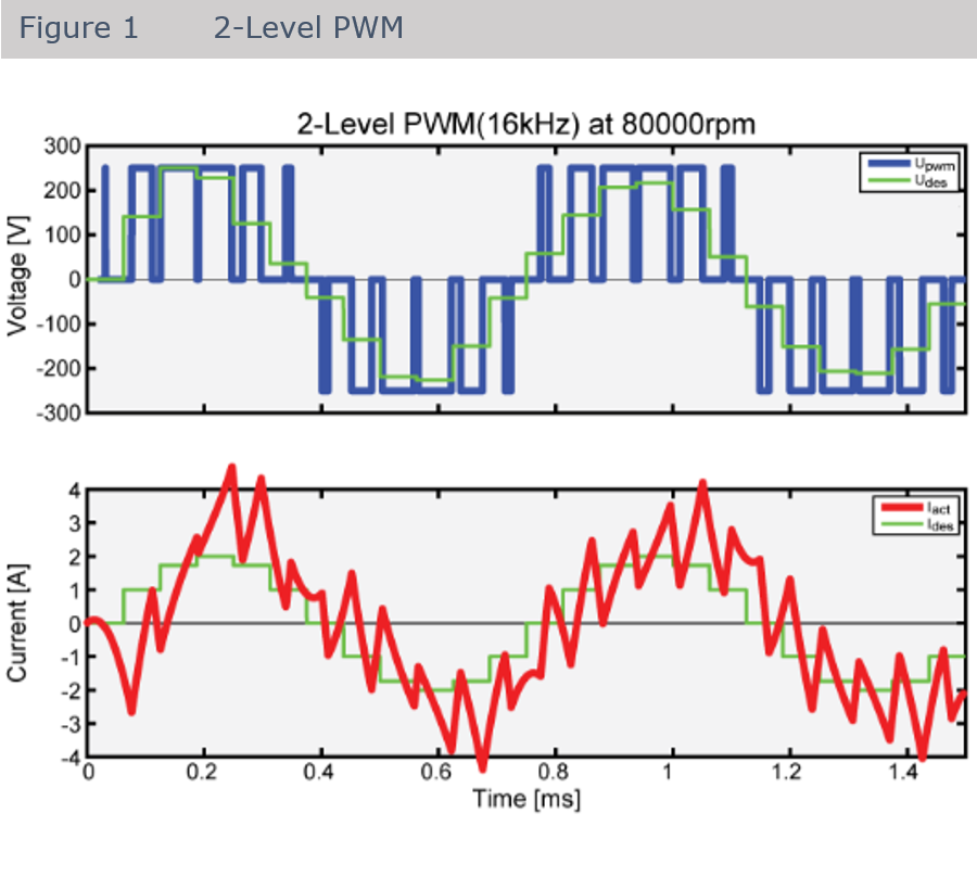 Our drives use an advanced 100kHz 3 Level PWM Technology (figure 2) which is especially useful if higher speeds (higher voltages) are required and the motor inductance is in the single digit mH range (typical for our products). In this case the current raises very fast and if the PWM frequency is to slow (figure 1) the actual current (red) shows high peaks (overshoot). Also the three level switching is much closer to an ideal sinusoidal signal form compared to the 2 level PWM. This reduces the current ripple in the winding by a factor of 10.